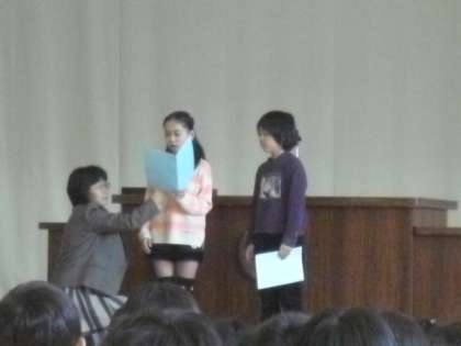 修了式の中で4年生の児童代表が言葉を述べました。この1年間で自分自身ができるようになったことやクラスがまとまってきたことの喜びが語られました。聞いている子どもたちの態度もとてもよかったです。