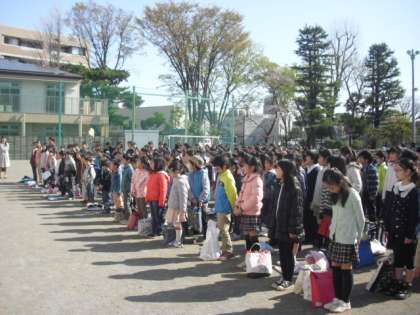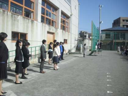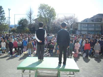 校庭で着任式・始業式を行いました。