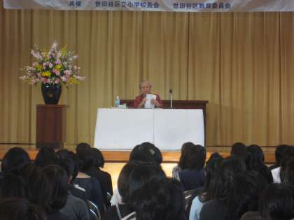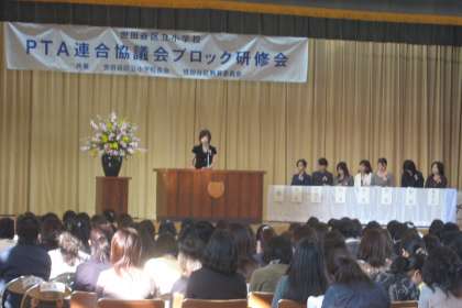 桜、桜丘、世田谷、経堂、赤堤、船橋、希望丘そして笹原の8つの小学校のPTA278名が集まり、研修会を本校体育館で行いました。第1部では、各校からの単P研修会報告がありました。第2部では、教育ジャーナリスト青木悦先生による講演「幻の親子像にとらわれていませんか?子供と生きる「あなた」へのメッセージ」がありました。