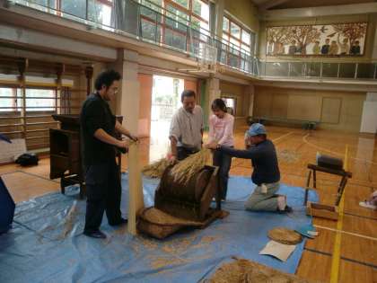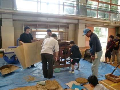 5年生は、稲作をこれまでJA世田谷目黒にお世話になり、取り組んできました。今日は、世田谷区農業青壮年連絡協議会の方々が千歯扱き(せんばこき)、足踏脱穀機 (あしぶみだっこくき)、唐箕(とうみ)、もみすり機を持ってきてくださいました。実際に体育館で実演もしました。子どもたちは初めての経験に驚いていました。
