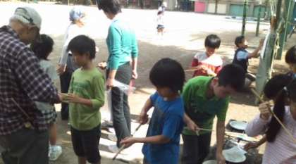 かがやく目の方々から、ていねいに繰り返しご指導いただき、竹で作った空気鉄砲で遊びました。