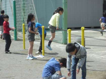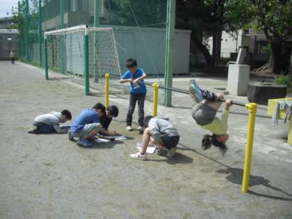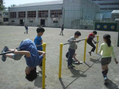 3年生が鉄棒でさまざまに技に挑戦していました。