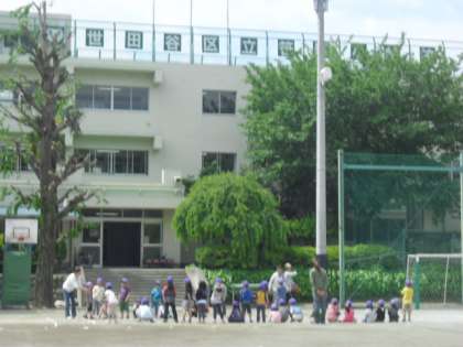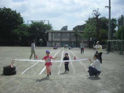 桜丘幼稚園の年長さんが来て、校庭でタイム走をしました。