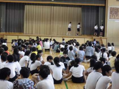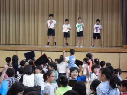 今朝の児童集会は、クラスごとのグループで、集会委員のお腹や背中につけた文字を読み取って、その言葉を考えるという楽しい集会でした。