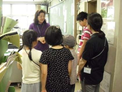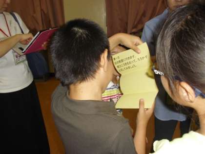 グループに分かれ、指令文にしたがって仲良く校内を探検しながら楽しく交流しました。