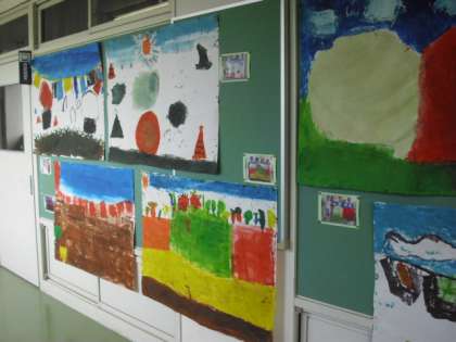 図工で制作した「ローラーで運動会」の作品を3階廊下に展示中です。
