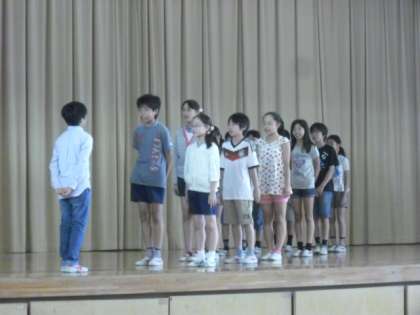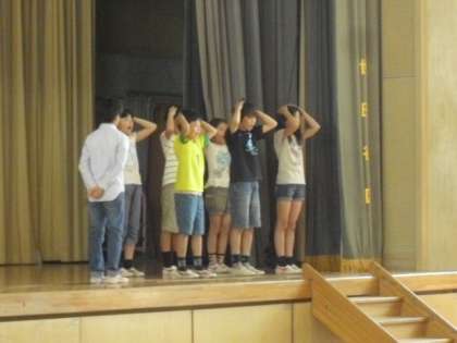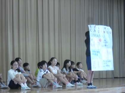 プール使用のきまりについて体育委員が実演してみんなに説明しました。