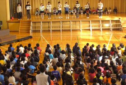 先週からインフルエンザ、インフルエンザ様の児童が0〜2名と少なくなったので、久しぶりに体育館で行いました。みんな静かに聞いていました。