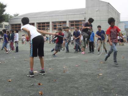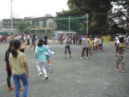 今日の体育朝会は全校児童で長縄にチャレンジです。