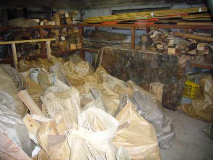 体育倉庫の中のたくさんの袋に薪が入っています。この薪は、おやじの会の方々が、餅つき等のときのために、切って並べてくださったものです。