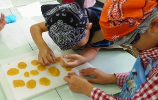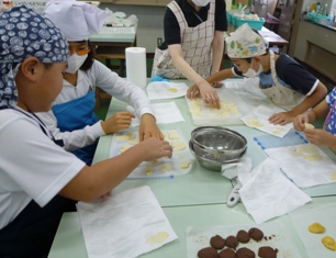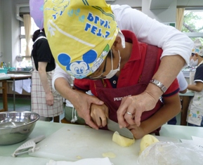 自立活動の学習として火を使わないレンジクッキングをしました。目の教室の畑で収穫したカボチャをおりまぜたクッキーと、油で揚げないポテトチップスを作りました。子どもたちは緊張した表情で包丁を握り、左手は「猫の手」でジャガイモを押さえ、薄切りに挑戦しました。グループ内の高学年の児童が低学年の児童に優しく教えながら活動するほほえましい姿も見られました。
