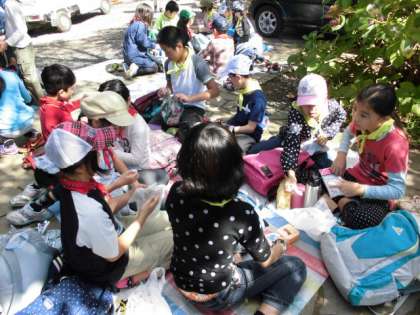 山で食べるお弁当は格別でした。またそのあとのおやつを楽しく食べていた子どもたちです。