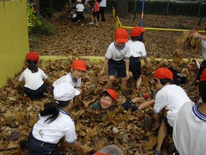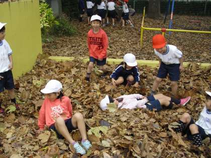 1年生は砂場に落ち葉をたくさんまいて、落ち葉のベットで遊びました。