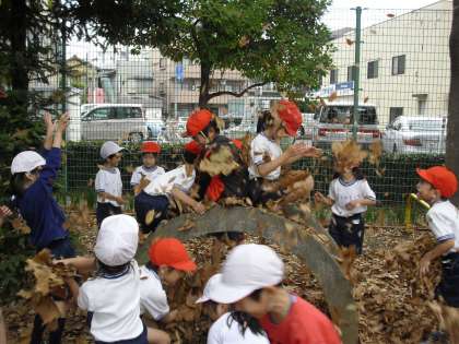 子どもたちは、寝転んだり、落ち葉をかけ合ったり、楽しく活動しました。