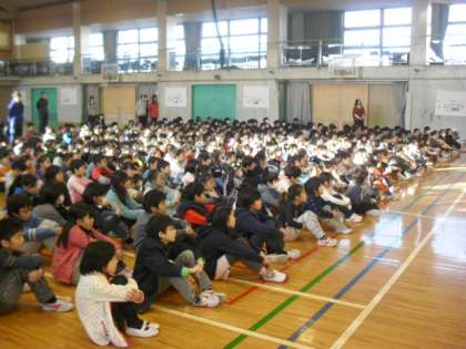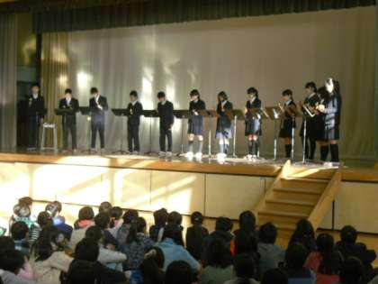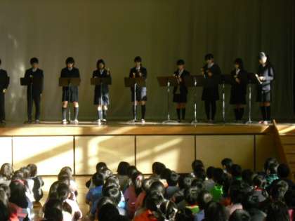 児童朝会に桜丘中学校生徒会のみなさんが来て、