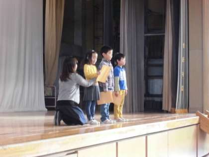 児童代表として1年生の3人からは、展覧会の作品づくりをがんばったこと、笹の子まつりで、高学年のお兄さんお姉さんの仕事ぶりがかっこよかったこと、漢字と計算の勉強をがんばったこと、の話がありました。