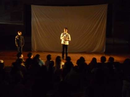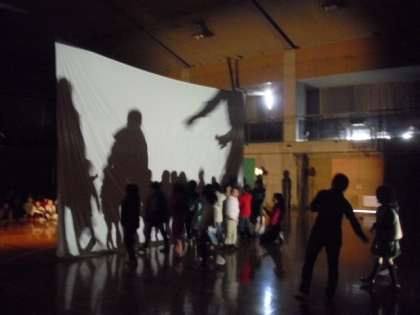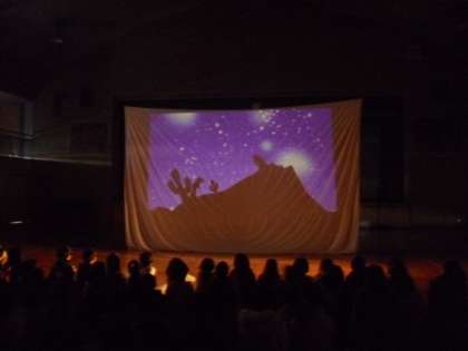 影絵の劇団「かかし座」がきて、体験授業を行いました。