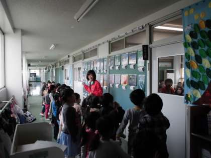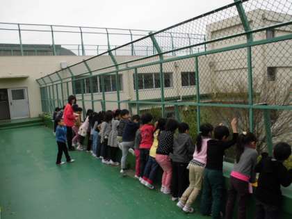 3階の南校舎と北校舎をつなぐ通路で、高いところからの眺めを楽しんでいる子どもたちです。思わず「わあー」と歓声があがりました。