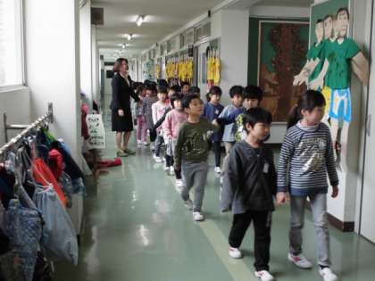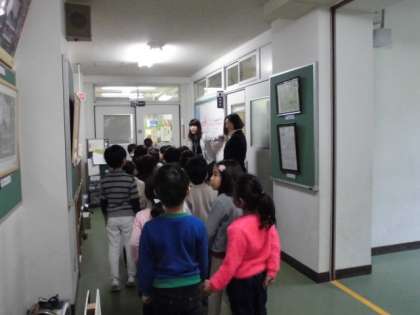 仲良く手をつないで、校内たんけんです。