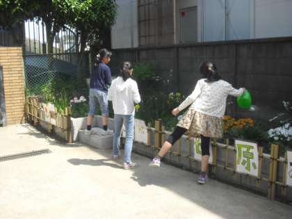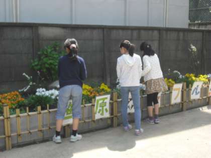 エコグリーン委員会の子どもたちがガーデンの花に水やりをしています。