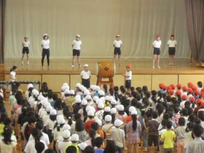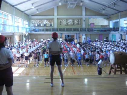 今日の音楽朝会は体育館で運動会の歌の練習をしました。