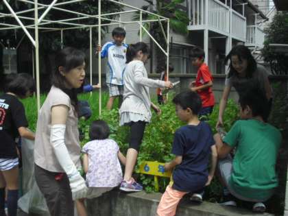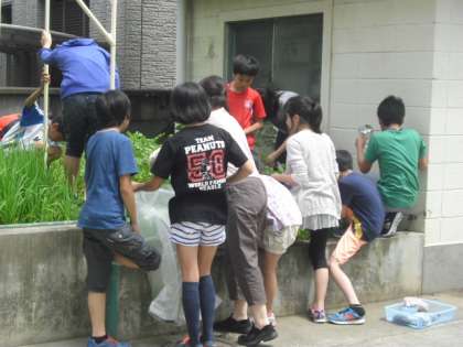 6年生が学年の畑で何やら楽しそうに歓声をあげています。