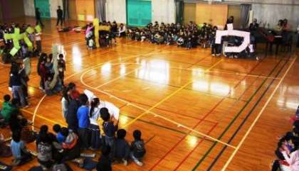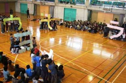 3年生は、全員で歌「YELL」を歌い、グループでパネルを使った文字作りを行いました。