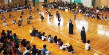 1年生は、6年生が学芸発表会のときに演じた「魔法を捨てたマジョリン」を生かした歌と踊りでした。6年生も一緒に歌っていました。