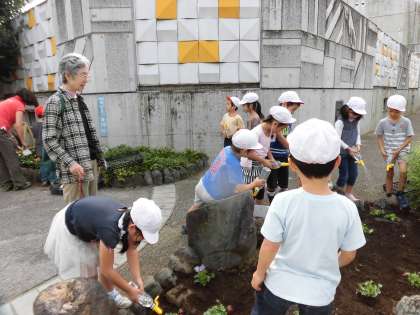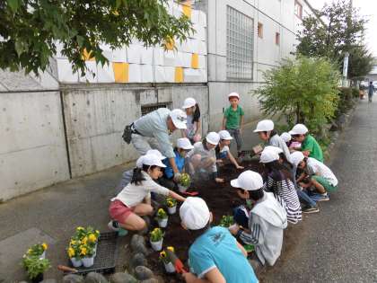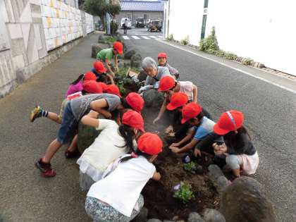 ぐるうぷ街の皆さんと学校の近くの花壇に花の苗を植えました。