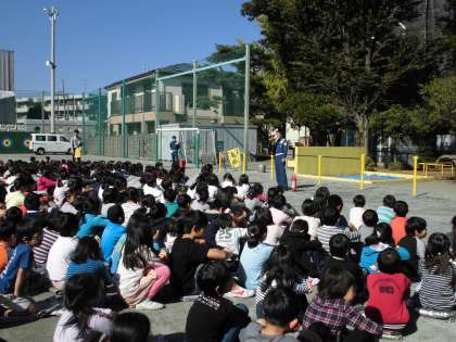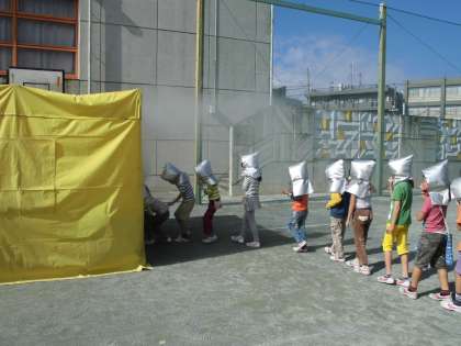 放送を聞いて、静かに校庭に集合しました。先生や主事さんの行う消火器を使った消火訓練をみました。そのあと煙でいっぱいのテントの中を通る訓練をしました。