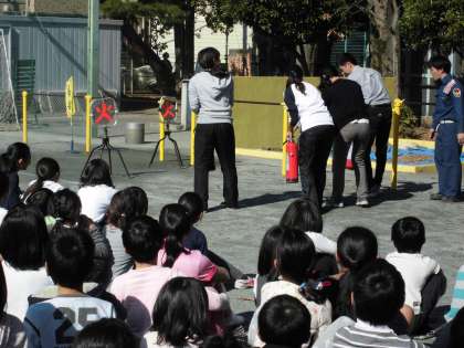今日の避難訓練は、初期消火と煙中体験訓練です。