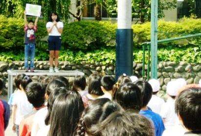 最初にスピーチをした子どもは、大好きな小田急線の電車について話しました。本校から小田急線の電車は、よく見えます。左側写真の右隅にも写っています。