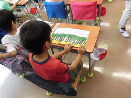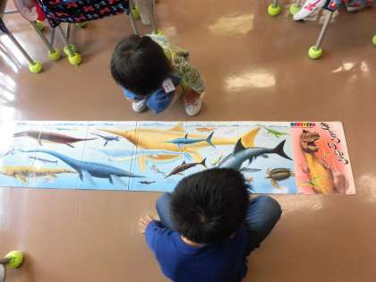 床に広げて恐竜の姿をながめていました。