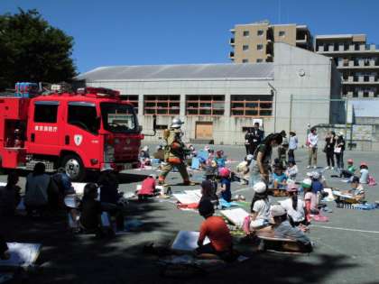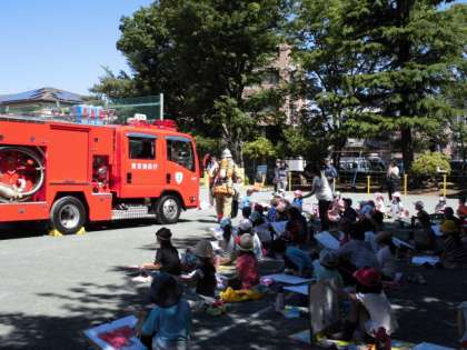 消防服を着た消防士さんに子どもたちは大喜びで、画用紙いっぱいに消防車を描いていました。