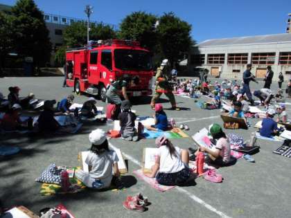 世田谷消防署宮坂出張所から、6人の消防士さんに来ていただいて、消防車を間近に見ながら、描きました。