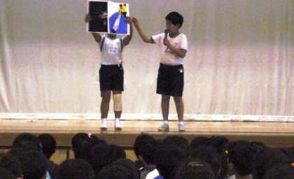 6年生は、スピーチをするとき、写真を見せたり、実演をしたりするなど、それぞれが工夫しています。1〜6年の児童全員が静かに真剣に見て聞いています。他の学年も各学級でスピーチに取り組んでいます。6年生は、みんなのよいお手本です。