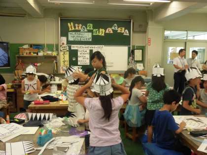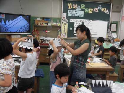 画用紙で帽子を作っています。