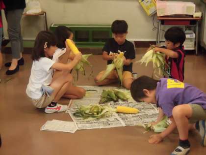 食育の取り組みでトウモロコシの皮むきを体験しました。
