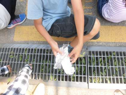 葉にアルミをかぶせて光合成を確かめる実験をしています。