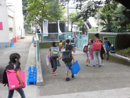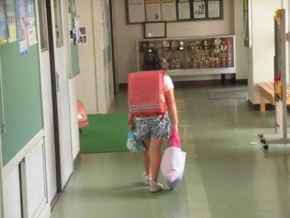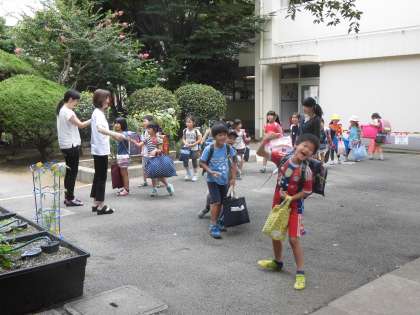 子どもたちは荷物をたくさん持って家路に向かいます。