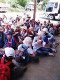 りんご園でジュースを飲みました。1人分のジュースを作るために、りんご1個と半分を使っているそうです。(午前10時頃)