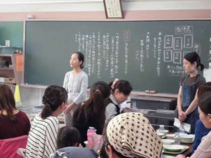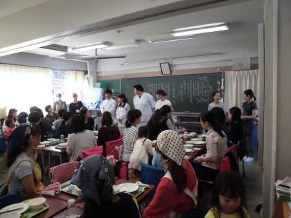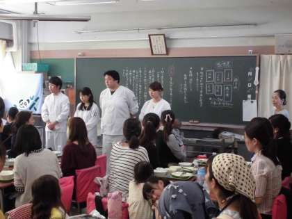 子どもたちにも大人気のジャンボ餃子ですが、餃子の皮が特注サイズで一つ一つ手作りをしていることやイモ類や豆類を給食に取り込んでいるわけなどの話が栄養士よりされると、参加した保護者の方々から、驚きの声が上がったり納得の表情が見られたりしました。