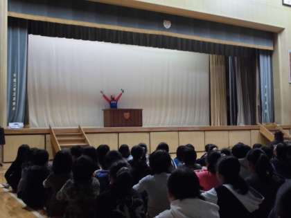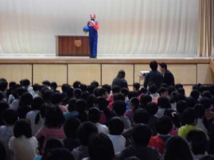 朝会で、マリオに扮した校長先生よりオリンピック・パラリンピックのお話がありました。
