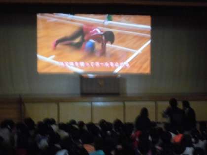 いつもと違う月曜朝会に、子どもたちはワクワク、ドキドキ。「これはゴールボールです」「2日にゴールボールのパラリンピアンの高田さんが来校します」というお話に、2日水曜日への期待を高めていました。