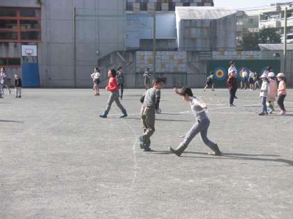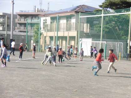 校庭に出てきた子どもたちが歓声を上げて遊んでいます。
