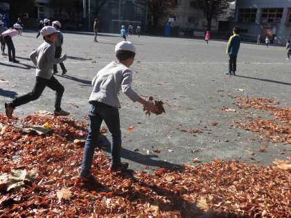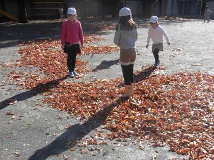 落ち葉の山ができて、子どもたちが遊んでいました。