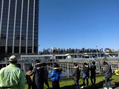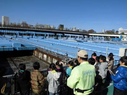 水再生センターでは4つのグループに分かれて、担当の方から詳しく説明を聞いたり、実際に施設を見学したりしました。子どもたちはとても熱心にメモを取りながらお話しを聞くことができました。