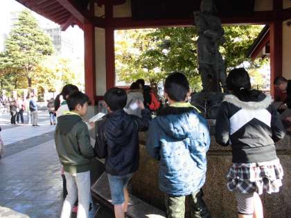 浅草浅草寺は、観光客で込み合っているなか、4,5人のグループで仲良く協力して見学しました。