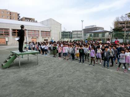 “1年生を迎える会”で全校の仲間入りをした1年生も参加して、校庭で児童朝会を行いました。