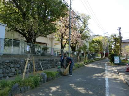 今朝は、登校してくる子どもたちに“おはようございます!”と声かけをしながら、横断箇所での旗振り、桜の花の散った正門や歩道の掃き掃除などを精力的に行っていました。また、子どもたちが登校した後には、校舎内や校舎周辺の環境維持の作業に入っています。